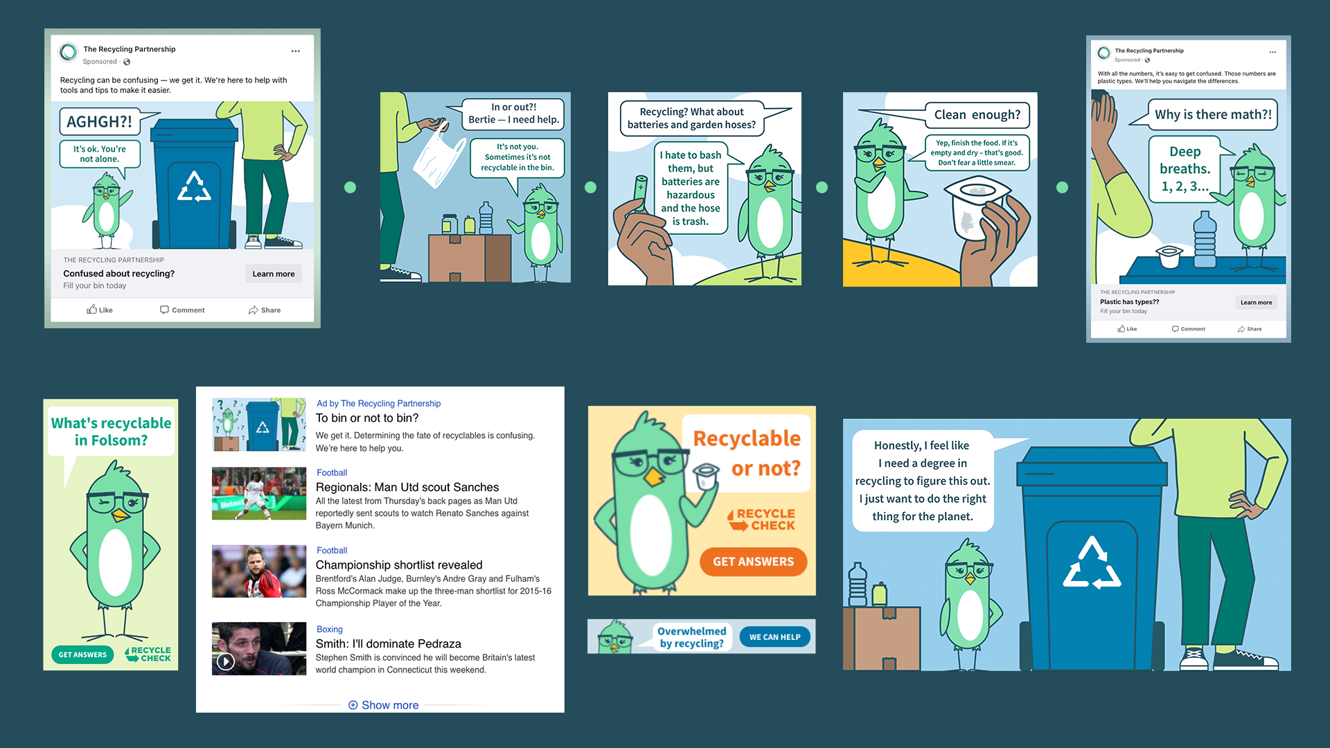 Following the success of a research pilot and leveraging The Recycling Partnership’s Recycle Check tool, we developed the recycling life coach Bertie that would be at your side when you’re bin-side so you can recycle with confidence.
